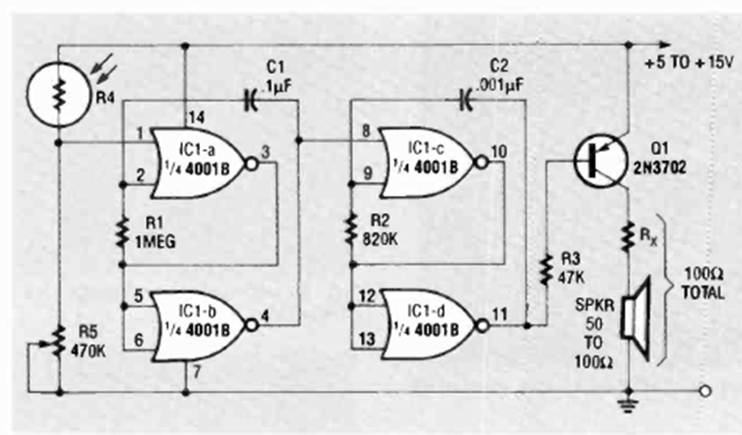 Este circuito de alarma se encontró en la edición de julio de 1992 de la revista Radio Electronics. El circuito utiliza una pequeña etapa de potencia para el altavoz y tiene un ajuste de sensibilidad en R5.
