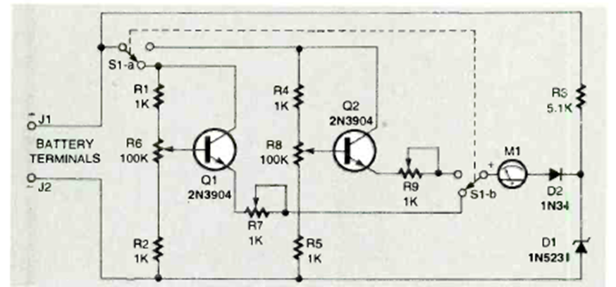 Este circuito se encontró en un artículo de la revista Electronics Now de marzo de 1997. Los transistores son de uso general y el indicador es de tipo analógico de escala completa de 1 mA.