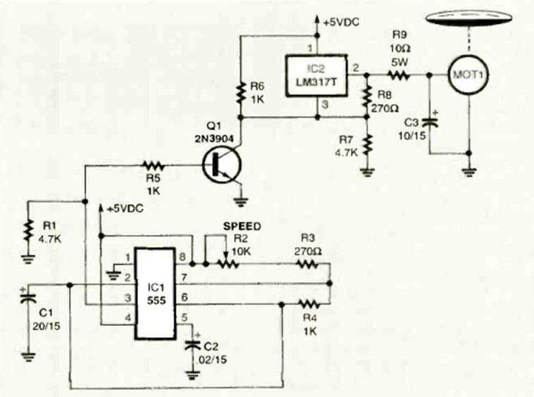 Para experimentos con un disco giratorio a diferentes velocidades, la edición de abril de 1998 de la revista Electronics Now sugiere este control de motor PWM. La corriente con el LM317 es de 1,5 A como máximo.