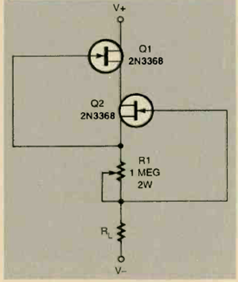Este circuito puede suministrar corrientes ajustadas por R1 en un rango de valores que depende de los transistores utilizados. El circuito es de una revista Electronics Now de octubre de 1998. Para los tipos indicados un máximo de 20 mA.