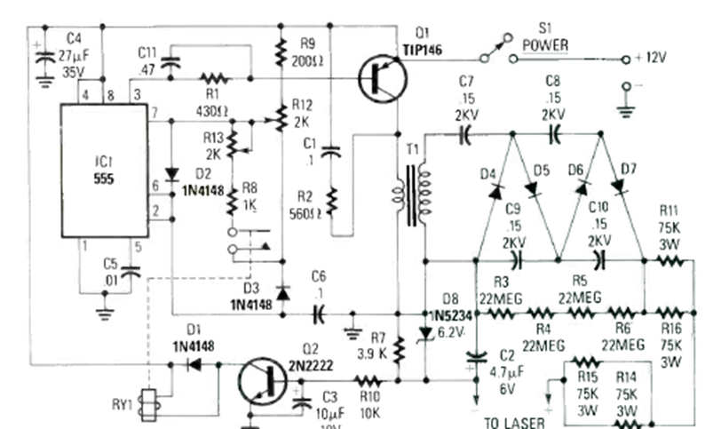 Esta fuente de alta tensión para tubos láser de gas se encontró en el número especial de 1990 de la revista Radio Electronics. El circuito consta de un inversor con multiplicador de tensión.