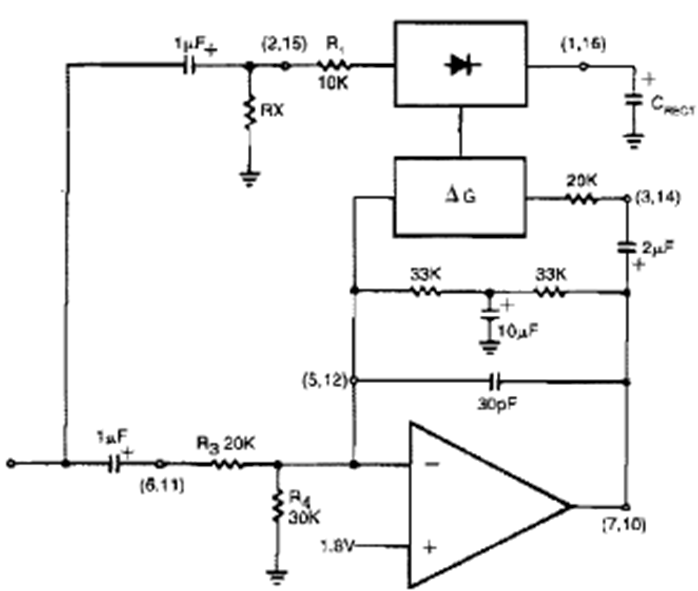 Este ALG, o control automático de nivel de señales de audio, se obtuvo de la revista RF Communications Handbook de 1989. El circuito mantiene la señal entre +14 y +43 dB; el circuito operativo es de propósito general.