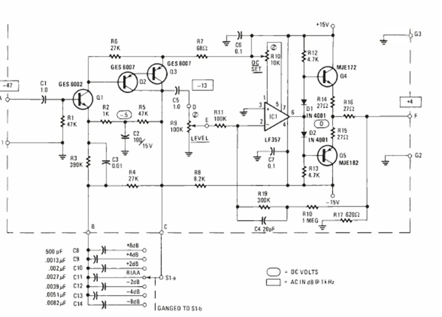 Este circuito fue encontrado en los Radio Electronics Special Projects de 1981. El circuito es estéreo y tiene una ganancia excelente utilizando componentes de la época que aceptan equivalentes modernos.