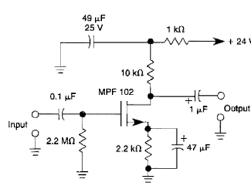 Esta etapa amplificadora de propósito general se encontró en la Enciclopedia de Circuitos Electrónicos, Volumen 5, de 1995. Se puede utilizar cualquier JFET y la banda de paso es de 100 kHz con 20 dB de ganancia.