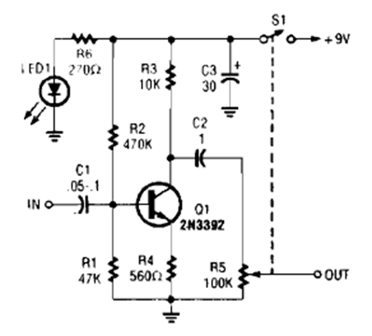 Este sencillo amplificador de audio surgió de Popular Electronics en los años 90. Sirve para amplificar señales muy débiles al conectarse a la entrada de un amplificador más potente.