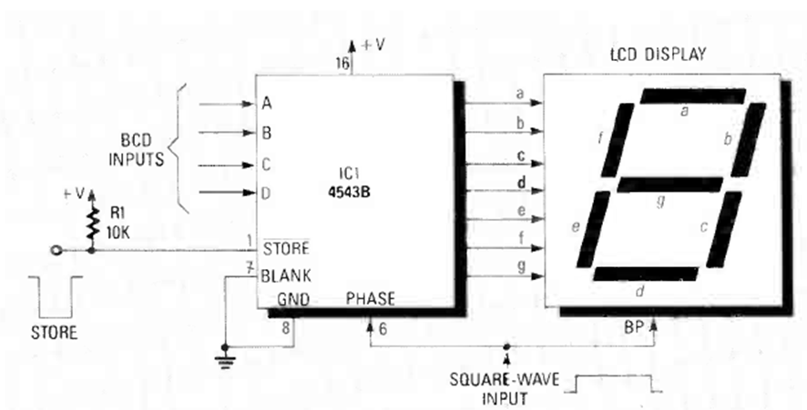Este circuito CMOS para pantallas LED es de una revista Radio Electronics de febrero de 1989. El circuito tiene un pulso de habilitación para almacenar el valor que se muestra en la pantalla.