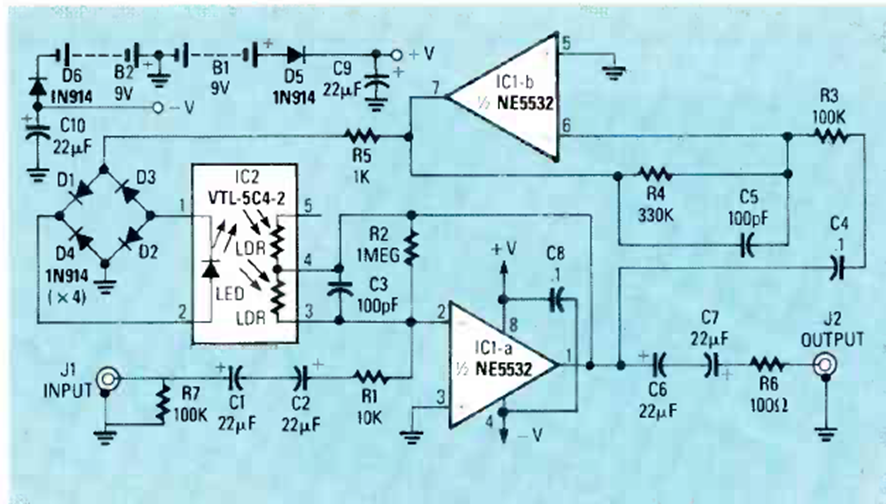 Este circuito para señales de audio se encontró en la edición de marzo de 1990 de la revista Radio Electronics. El circuito utiliza un optoacoplador diferente que se puede reemplazar por uno equivalente.