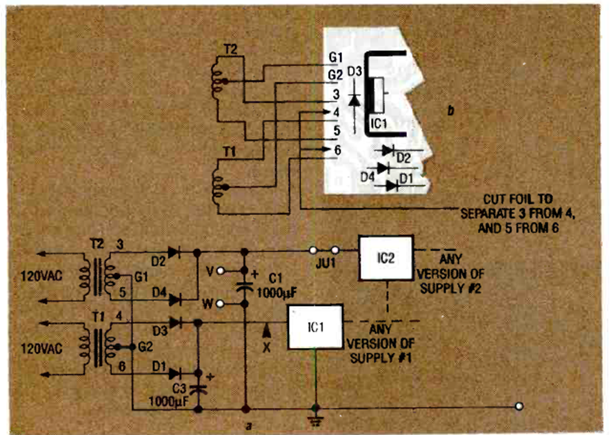 Esta fuente de alimentación de 1 A utiliza circuitos integrados de la serie 78. La encontramos en la edición de junio de 1990 de la revista Radio Electronics. Los circuitos integrados deben estar equipados con disipadores de calor.