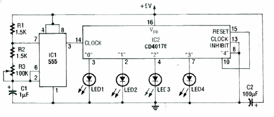 Este circuito fue obtenido de la edición de febrero de 1992 de la revista Radio Electronics. En él, una barra de 4 LED parpadea continuamente a una velocidad dada por C1 y el ajuste de R3.