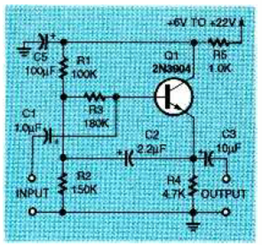 Encontramos este circuito en la edición de marzo de 1994 de la revista Electronics Now. El transistor es de uso general y es apto para cápsulas de cerámica o cristal y micrófonos.