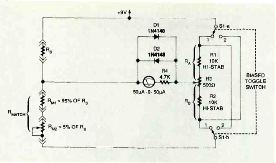 El propósito de este circuito es encontrar dos resistencias con valores muy cercanos para proyectos críticos. El circuito fue encontrado en la edición de noviembre de 1995 de la revista Electronics Now.