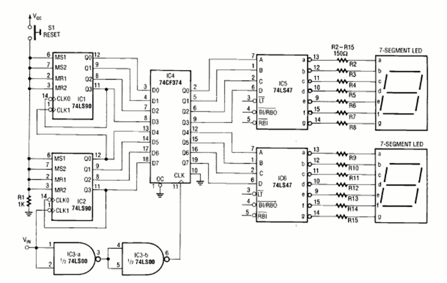 Este contador TTL se encontró en la edición de marzo de 1991 de la revista Radio Electronics. El circuito es parte de un proyecto más grande y debe ser alimentado con una tensión de 5 V.