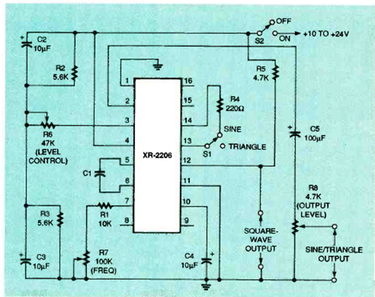 Este circuito fue encontrado en la edición de enero de 1996 de la revista Electronics Now. El circuito está alimentado de 10 a 24 V y tiene un control para la intensidad de la señal de salida.