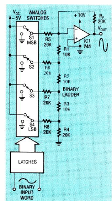 Este generador de escalera se encontró en la edición de julio de 1991 de la revista Radio Electronics. Su propósito es generar una señal sinusoidal a partir de señales de entrada binarias.
