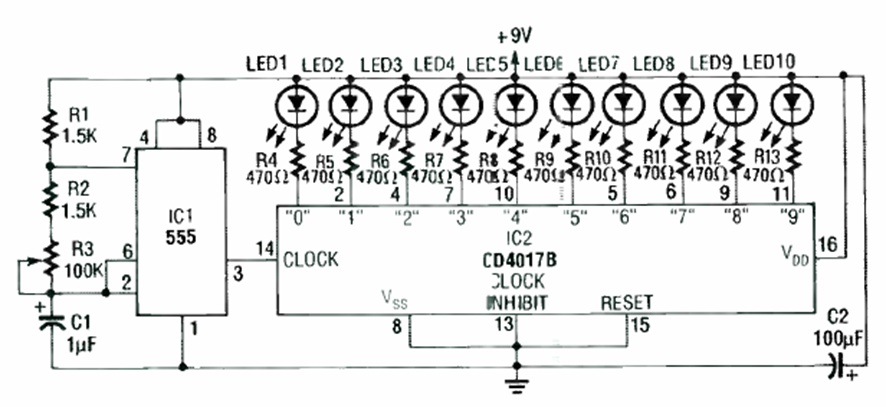 Este circuito es de una revista Radio Electronics de febrero de 1992. El circuito tiene la velocidad del efecto dependiente de C1 y ajustada por R3.