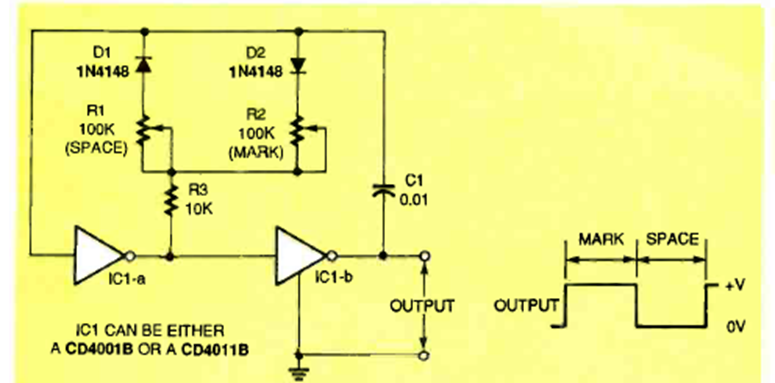 Encontramos este circuito en la edición de marzo de 1995 de la revista Electronics Now. El circuito tiene el rango de frecuencia de operación determinado por C1 y R3. La señal generada es rectangular.