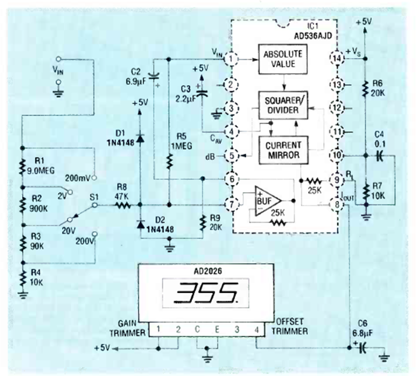Este circuito es de una revista Radio Electronics de agosto de 1990. El módulo indicador es de un tipo común en esa época.