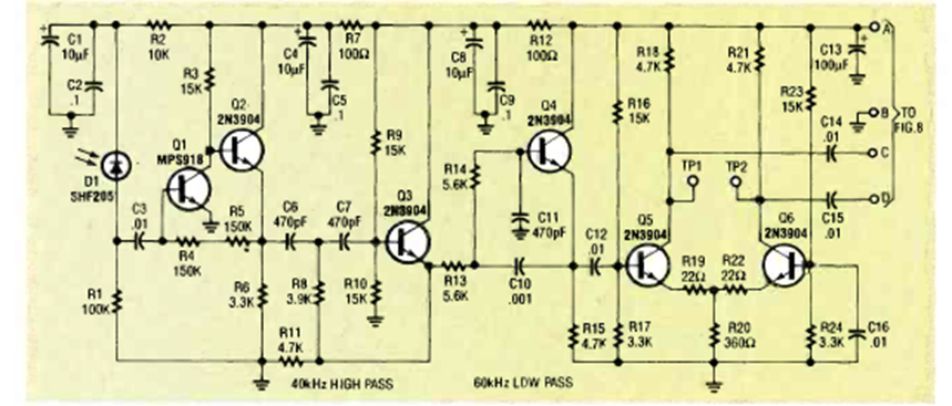Este es el receptor del circuito anterior que encontramos en la revista Radio Electronics de diciembre de 1992. El sensor es un fotodiodo que debe tener características ópticas como lentes.