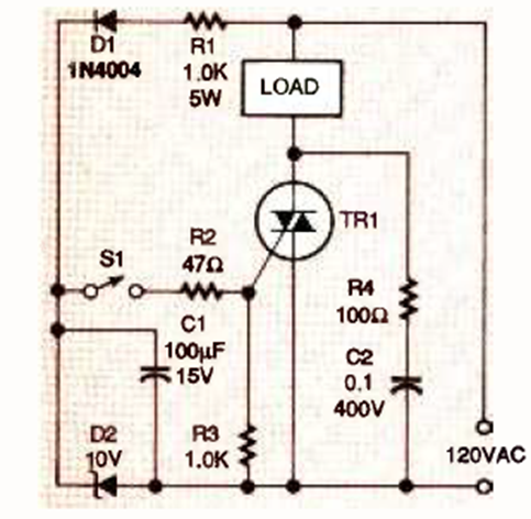 La carga controlada por este circuito depende del triac utilizado. El circuito es de una revista Electronics Now de junio de 1995.