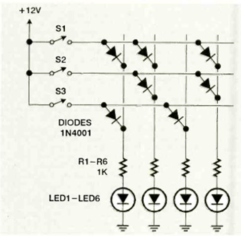 La combinación de diodos determina cuál de los LED se iluminará cuando se active uno de los interruptores. El circuito es de la revista Electronics Now, agosto de 1997.