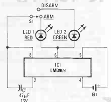 Los LED parpadeantes de este circuito publicado en la revista Radio Electronics Experimenter de 1989 lo hacen parecer una alarma que mantiene alejados a los posibles ladrones.