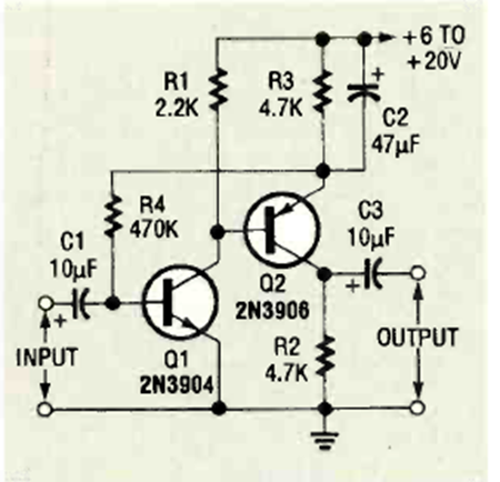 Este circuito se encontró en la edición de noviembre de 1993 de la revista Electronics Now. Utiliza transistores de propósito general y tiene una alta impedancia de entrada. Es una alternativa al circuito del mismo tipo dado anteriormente.