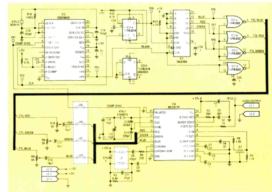 Este circuito para TV analógica genera barras en el estándar NTSC. Lo encontramos en la revista Radio Electronics de julio de 1991.