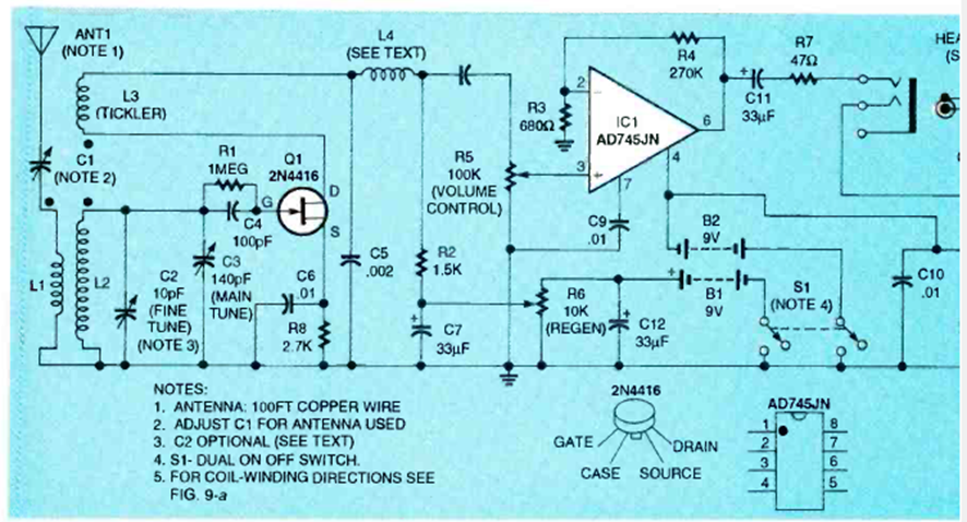 Este moderno receptor regenerativo apareció en la edición de marzo de 1994 de la revista Electronics Now. El circuito es para la banda de onda media. Se puede modificar a otros rangos cambiando las bobinas.