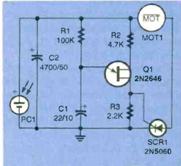 Este sencillo circuito de control de motor o robot que utiliza fotocélula como sensor fue encontrado en la revista Electronics Now de junio de 1997. La tensión de suministro depende del motor.