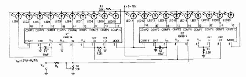 Este circuito tiene una escala de 0 a 2,56 V, pero se puede variar cambiando los valores de los componentes según la fórmula dada en el diagrama. Lo encontramos en la revista Radio Electronics de marzo de 1992.