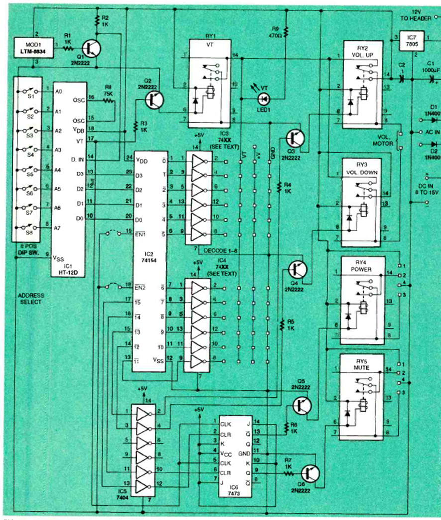 Este es el circuito receptor del transmisor anterior. El circuito tiene una clave de programación para decodificar las señales. Esta llave debe tener el código del transmisor.