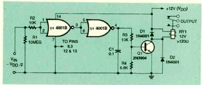 Este circuito utiliza dos puertos del 4001 para activar un relé. El circuito es de la revista Electronics Now, julio de 1994. El transistor es de propósito general la tensión de suministro es de acuerdo con el relé.
