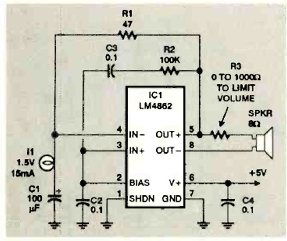 Utilizando una pequeña bombilla incandescente como regulador, este oscilador de puente de Wien produce una señal sinusoidal. El circuito es de una revista Electronics Now de noviembre de 1999.