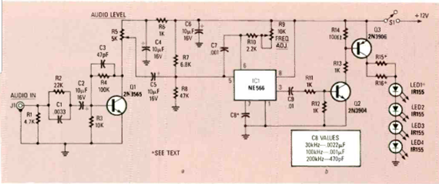 Este transmisor infrarrojo para sonido remoto inalámbrico es de un artículo publicado en la revista Radio Electronics de agosto de 1988. El circuito se puede realizar con LED modernos de mayor potencia.