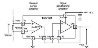 El circuito integrado TSC102 de ST-Microelectronics consta de un sistema de sensor de corriente que, además del amplificador de la propia señal del sensor, también incluye un amplificador acondicionador de señal. El circuito que se muestra en la figura 1 está alimentado por un voltaje de 5 V y tiene un rango de operación en modo común de 2,8 V a 30 V. El consumo de corriente es sólo 420 µA. Entre las aplicaciones sugeridas por ST se encuentran cargadores de baterías, monitoreo de corriente en sistemas automotrices, notebooks, control de motores DC, sistemas fotovoltaicos, fuentes de corriente de precisión, UPS y fuentes en general. El propósito del circuito es transformar la corriente que fluye a través de la resistencia del sensor (de valor muy bajo) en un voltaje proporcional referenciado a tierra para su procesamiento y control. El circuito integrado TSC102 se suministra en un paquete SO-8 o TSSOP-8.