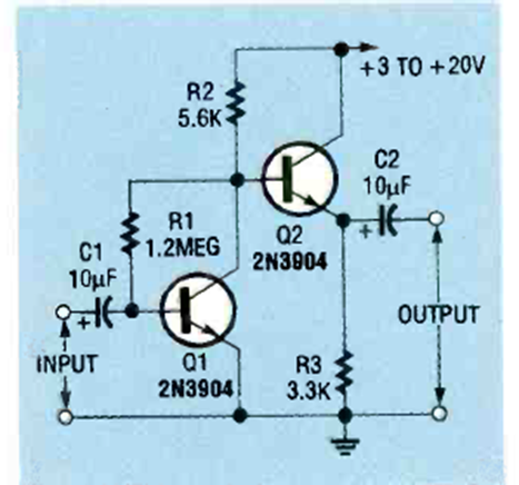 Este circuito se encontró en la edición de noviembre de 1993 de la revista Electronics Now. El circuito de dos etapas utiliza transistores de propósito general.