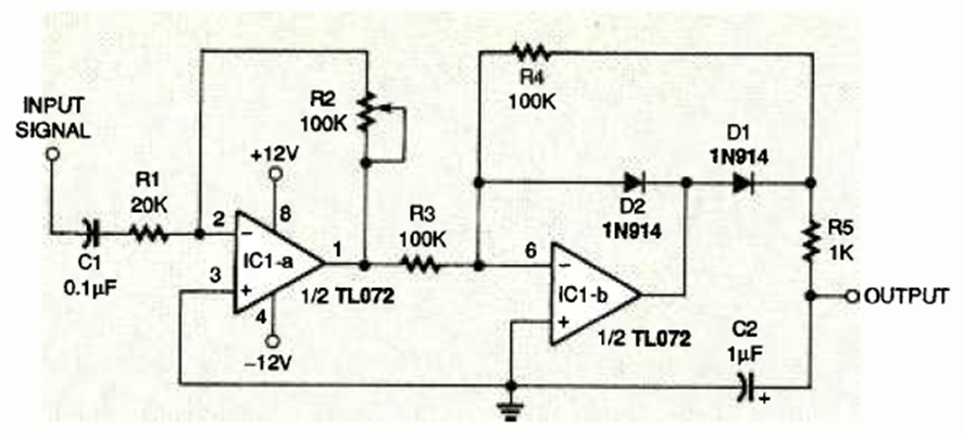 Este circuito se puede utilizar en indicadores de nivel de señal con LED. El circuito es de Electronics Now de enero de 1996. La fuente de alimentación debe ser simétrica.
