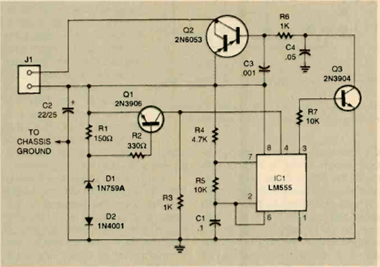 Este circuito hace una lámpara incandescente de hasta 100 W parpadeando en una frecuencia que se...