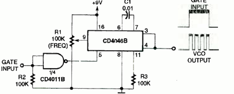 Encontramos este circuito en la edición de agosto de 1994 de Electronics Now. El circuito se basa en el ahora poco común CMOS 4046. El rango de frecuencia está dado por C1.