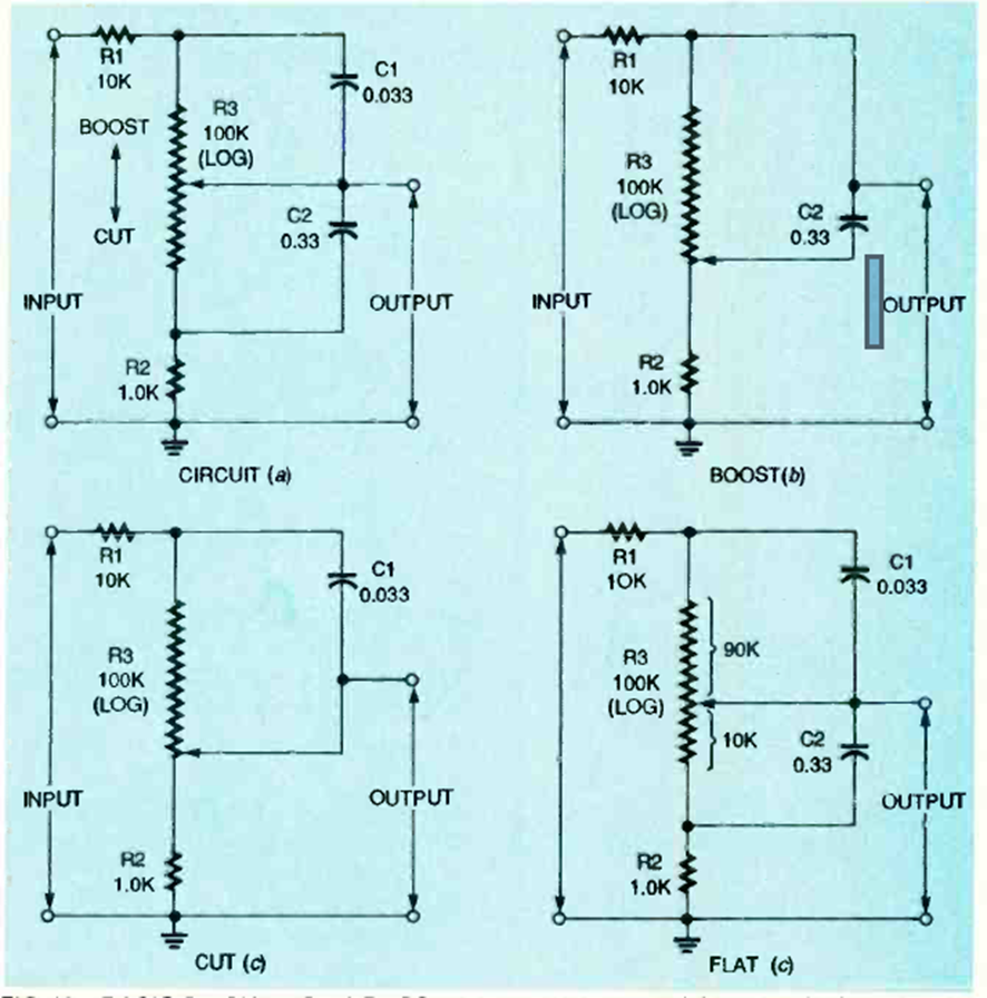 Estos controles básicos de bajos se tomaron de un artículo de la revista Electronics Now de febrero de 1995. Son circuitos pasivos básicos en (a) tono básico, (b) realce, (c) corte y (d) respuesta plana.