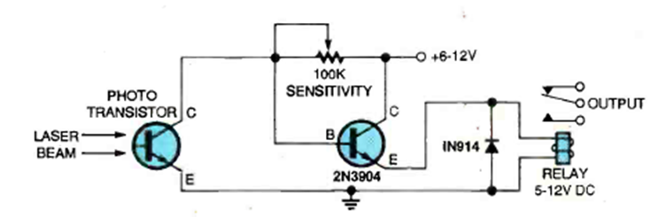 Este circuito activa un relé cuando se corta el haz de luz que incide sobre el fototransistor. El circuito es de Electronics Now y la tensión de alimentación depende de la tensión del relé.