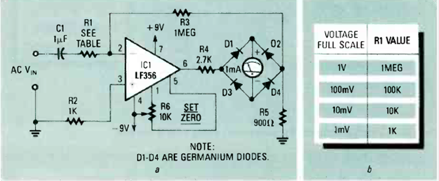 Este circuito, basado en el amplificador operacional LF256, fue encontrado en la edición de septiembre de 1989 de la revista Radio Electronics. El indicador es analógico y la fuente de alimentación debe ser simétrica.