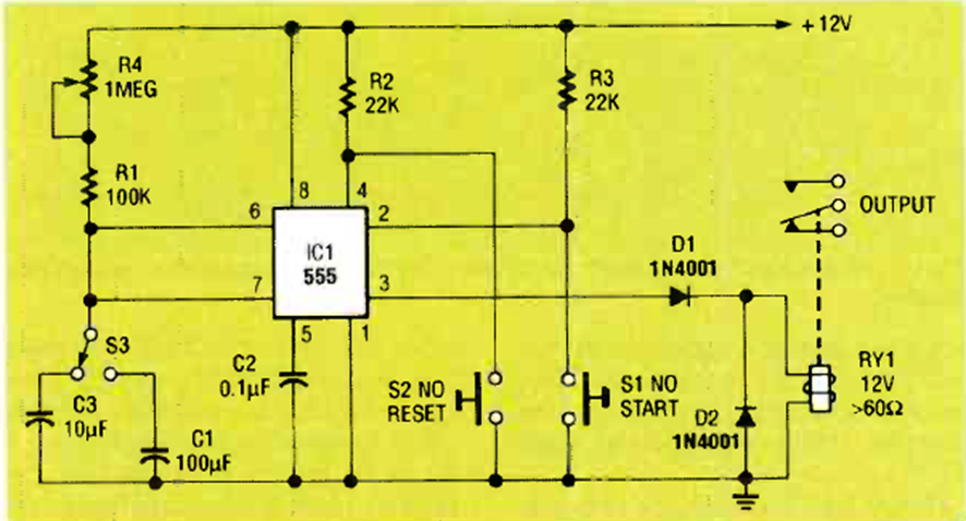 En la figura tenemos un temporizador simple con el 555 alimentando directamente un relé. El circuito es de la revista Radio Electronics de septiembre de 1992. Se pueden obtener otros tiempos con otro capacitor de hasta 1.000 uF.