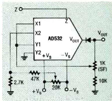 Encontrado en la revista Electronics Now de julio de 1993, este circuito proporciona un voltaje de salida cuyo valor es la raíz cuadrada de la tensión de entrada.