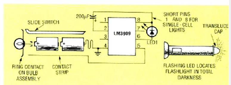 Este diseño de linterna con luz intermitente que la hace fácil de encontrar se encontró en la edición de enero de 1990 de la revista Radio Electronics. La luz utiliza una bombilla estándar.