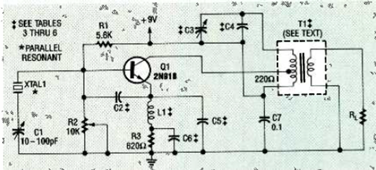Este circuito se encontró en la revista Radio Electronics de febrero de 1993. La frecuencia depende del cristal y R2 ajusta el punto óptimo de oscilación.
