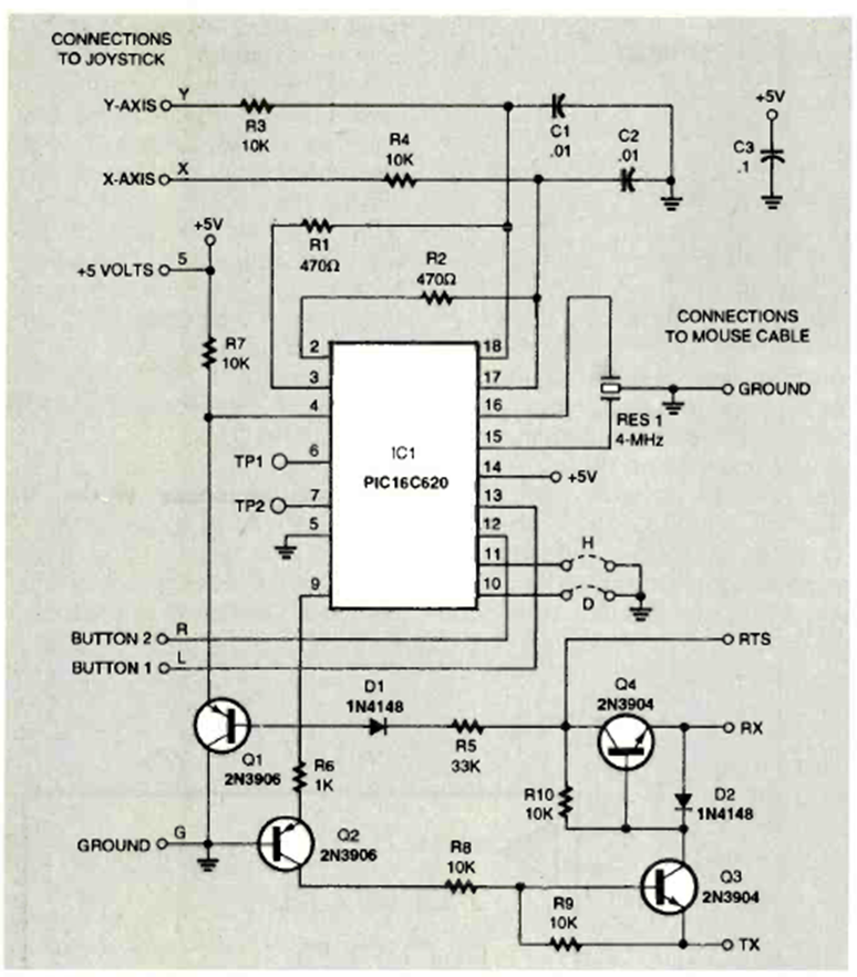 Este circuito de ratón fue encontrado en la edición de enero de 1997 de la revista Electronics Now. Utiliza un PIC que debe programarse en función de los movimientos.