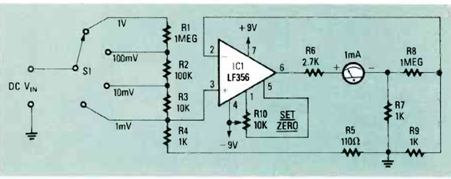 Este circuito, que utiliza un circuito operativo LF356, se encontró en la edición de septiembre de 1989 de la revista Radio Electronics. La fuente de alimentación debe ser simétrica y se puede utilizar un multímetro común en lugar del instrumento analógico.