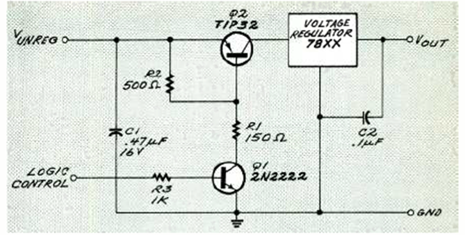 Encontramos este circuito en la edición de julio de 1994 de la revista Electronics Now. El circuito puede emplear otros transistores de potencia y transistores Q1 y de propósito general. El IC también puede ser de otro tipo y corriente.