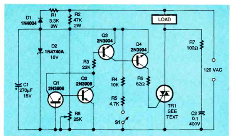 Este circuito sincronizado con triac se encontró en la revista Electronics Now de julio de 1995. El triac debe estar equipado con un disipador de calor dependiendo de la potencia.